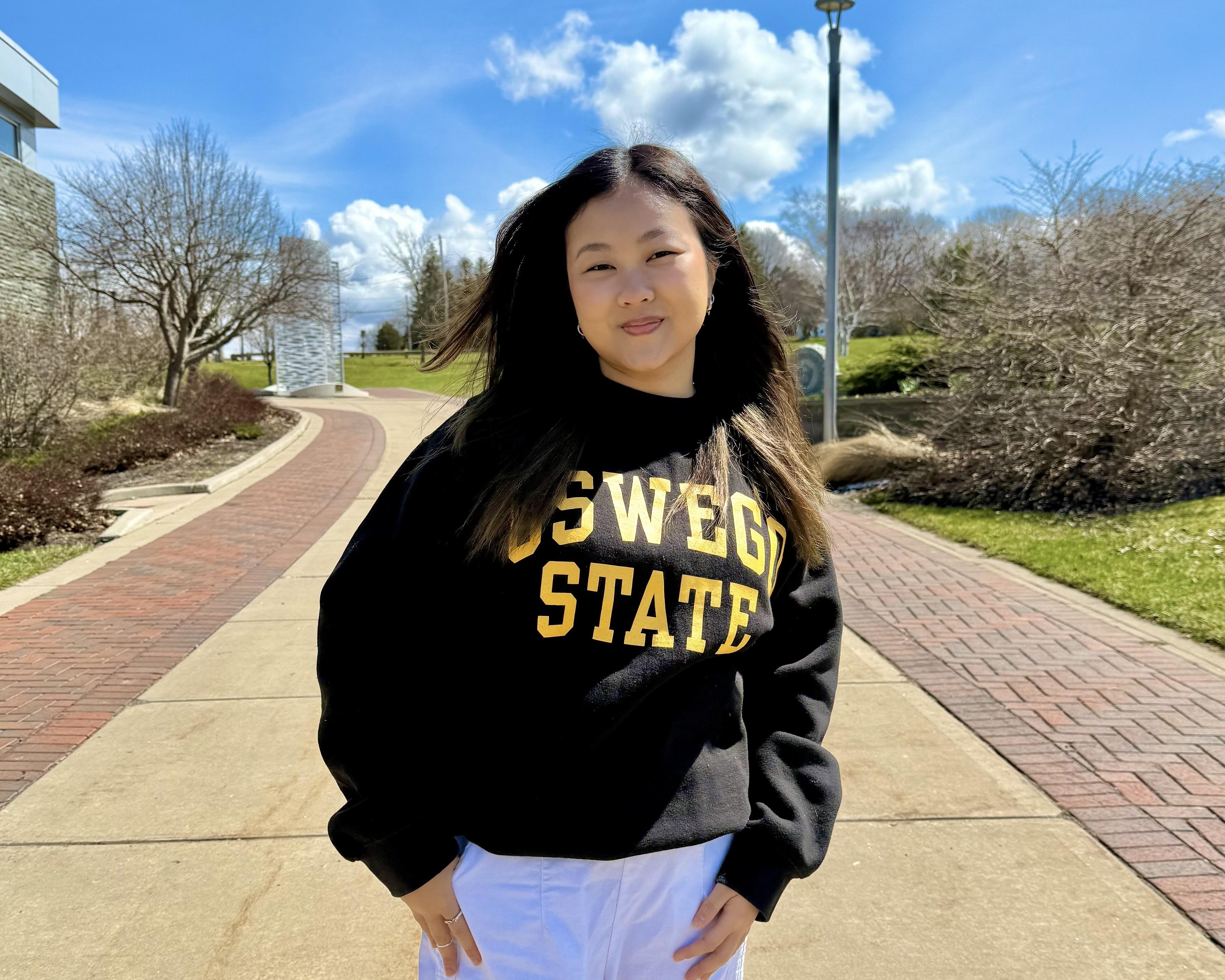 SUNY Oswego student Michelle Lau stands on campus in an black "Oswego State" sweatshirt.