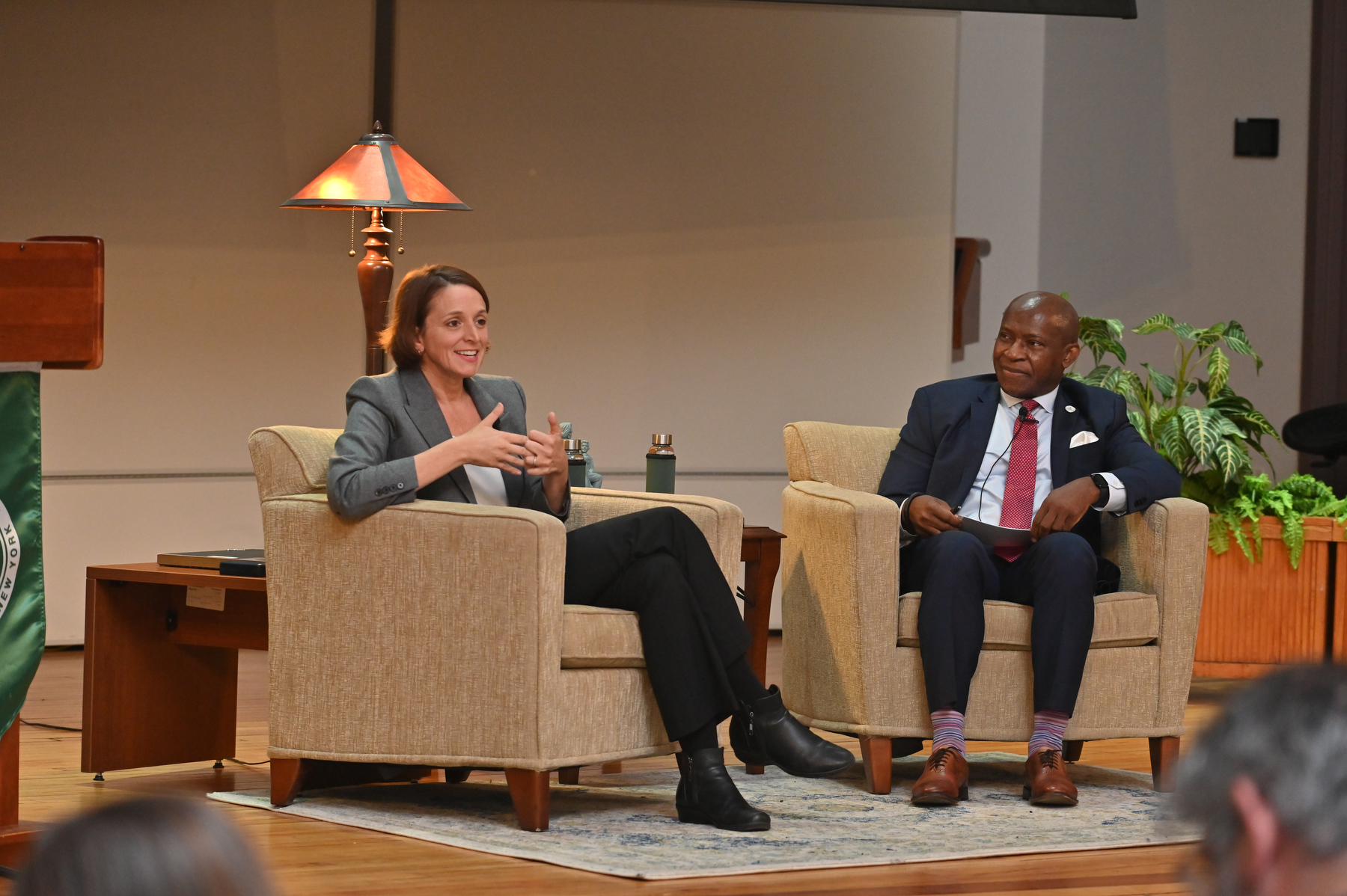 Sally Librera, president of National Grid New York, was the featured guest during SUNY Oswego’s second annual Sheldon Lecture on Leadership and Service on Oct. 24 in Sheldon Hall ballroom, interviewed by President Peter O. Nwosu. This lecture series is an informal “fireside chat” Q&A format which provides the SUNY Oswego and broader community access to a distinguished leader as well as an opportunity to be part of the conversation.